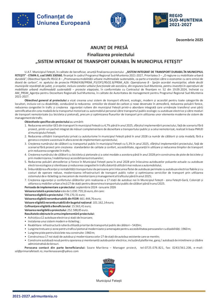 ANUNȚ DE PRESĂ Finalizarea proiectului „SISTEM INTEGRAT DE TRANSPORT DURABIL ÎN MUNICIPIUL FETEȘTI”