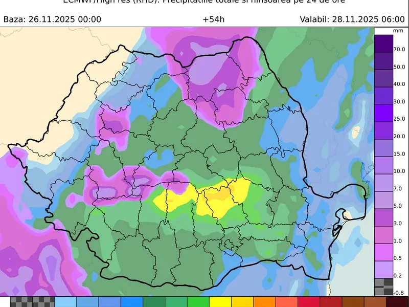 Vineri, 28 noiembrie, ciclonul va rămâne deasupra Greciei, iar frontul cald va continua să influențeze sudul României, unde se vor semnala în continuare ploi moderate (10–30 l/mp).