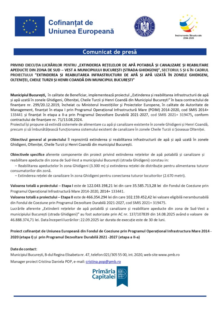 COMUNICAT DE PRESA PRIVIND EXECUȚIA LUCRĂRILOR PENTRU „EXTINDEREA REȚELELOR DE APĂ POTABILĂ ȘI CANALIZARE ȘI REABILITARE APEDUCTE DIN ZONA DE SUD – VEST A MUNICIPIULUI BUCUREȘTI (STRADA GHIDIGENI)”, SECTORUL 5 ȘI 6 ÎN CADRUL PROIECTULUI ”EXTINDEREA ȘI REABILITAREA INFRASTRUCTURII DE APĂ ȘI APĂ UZATĂ ÎN ZONELE GHIDIGENI, OLTENIȚEI, CHEILE TURZII ȘI HENRI COANDĂ DIN MUNICIPIUL BUCUREȘTI”