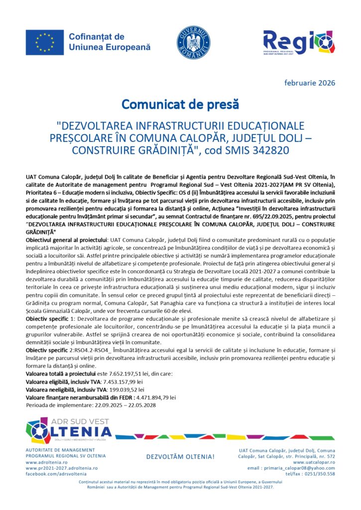 DEZVOLTAREA INFRASTRUCTURII EDUCAȚIONALE PREȘCOLARE ÎN COMUNA CALOPĂR, JUDEȚUL DOLJ – CONSTRUIRE GRĂDINIȚĂ
