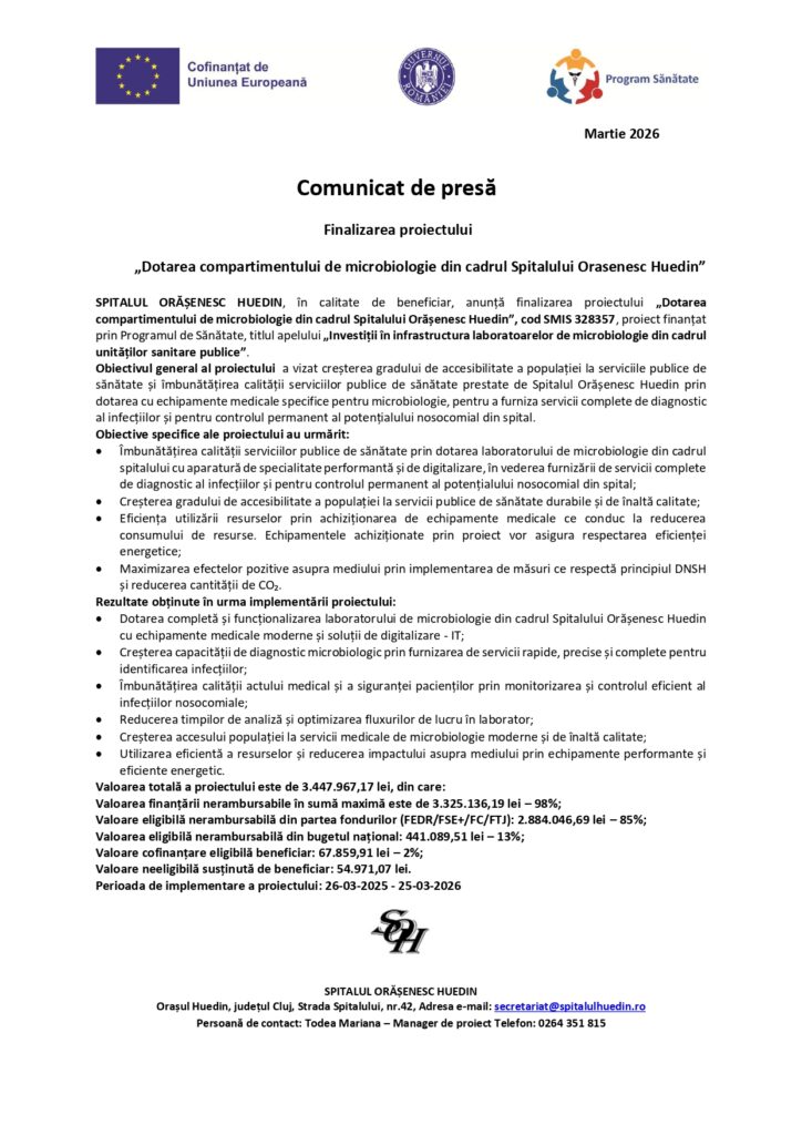 Dotarea compartimentului de microbiologie din cadrul Spitalului Orășenesc Huedin, cod SMIS 328357