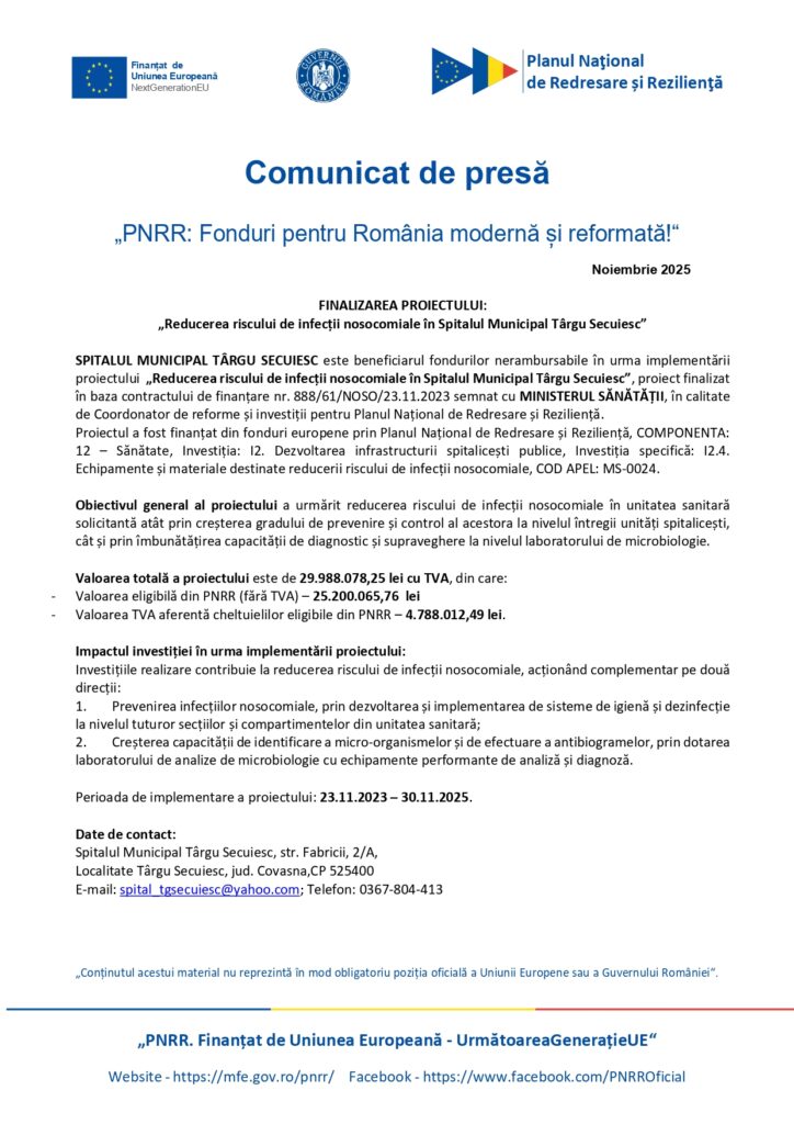 FINALIZAREA PROIECTULUI: „Reducerea riscului de infecții nosocomiale în Spitalul Municipal Târgu Secuiesc”