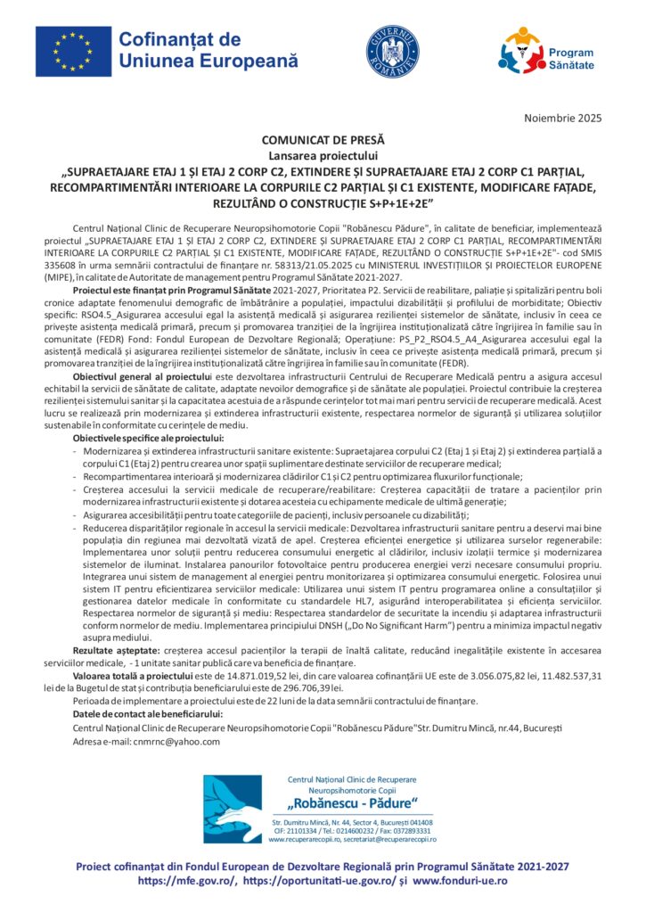 Lansarea proiectului „SUPRAETAJARE ETAJ 1 Șl ETAJ 2 CORP C2, EXTINDERE Șl SUPRAETAJARE ETAJ 2 CORP C1 PARȚIAL, RECOMPARTIMENTĂRI INTERIOARE LA CORPURILE C2 PARȚIAL ȘI C1 EXISTENTE, MODIFICARE FAȚADE, REZULTÂND O CONSTRUCȚIE S+P+1E+2E”